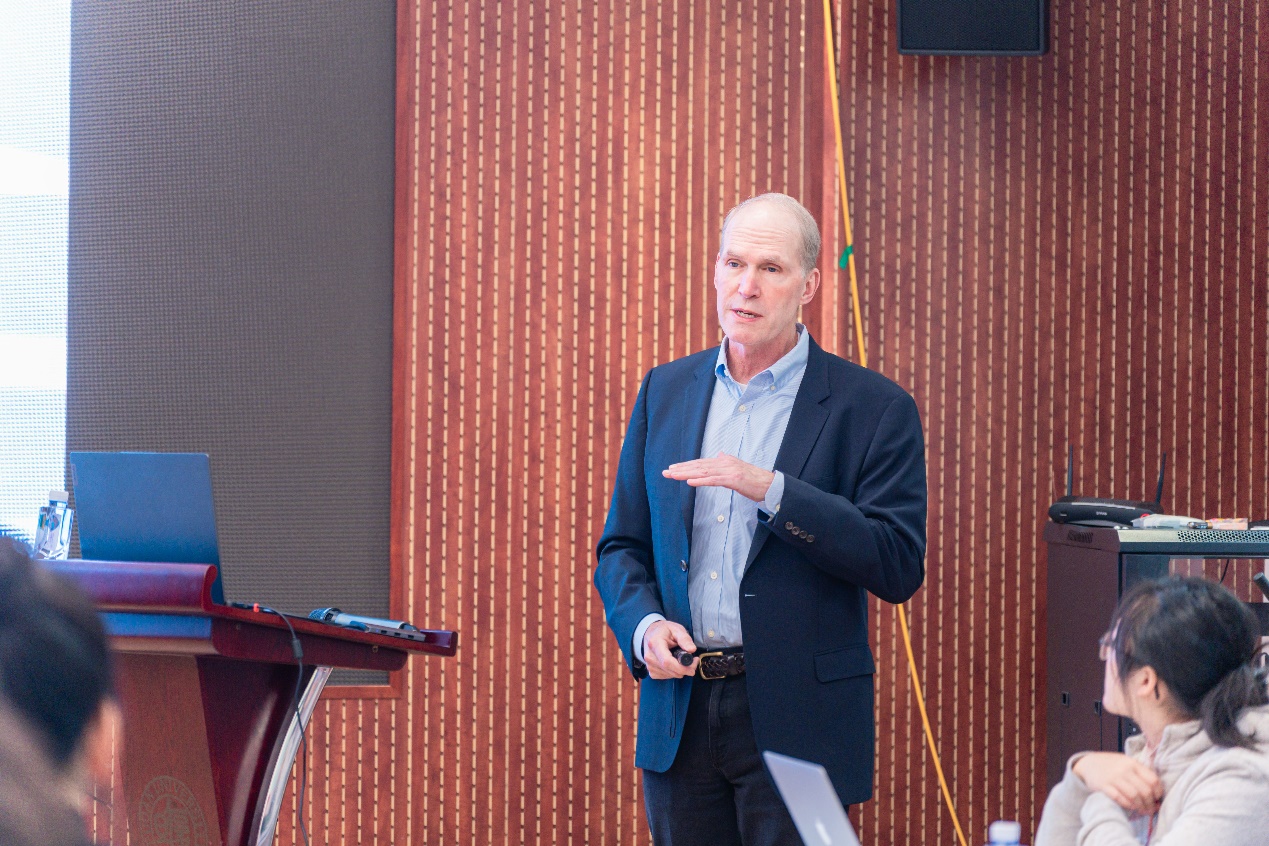 Rob Jackson院士此次报告的主题为“The global methane budget: natural and anthropogenic sources”。甲烷是仅次于二氧化碳的全球第二大温室气体,但其温室气体效应更强并在大气中的停留时间更短,因此近十几年以来受到更多关注。Jackson教授首先系统介绍了全球甲烷预算,主要的甲烷源与汇,以及目前估算的不确定性及主要挑战。接着,Jackson教授分析了甲烷排放对气候变暖的影响,并着重介绍起近期相关工作,包括估算全球湿地(包括水稻)的甲烷排放,以及如何监测和量化油气工业从生产、运输,到终端使用全工业过程中的甲烷泄露,以减少甲烷排放量估算的不确定性。比如,Jackson教授创新性地使用车载系统评估了城市的甲烷排放热点,发现由于使用年限较长且维护不善等原因,美国一些城市的燃气输送管道向大气排放了大量甲烷。基于此研究,一些城市已经在逐步制定政策维修或更改燃气管道。同时,Jackson教授首次系统评估了家用燃气使用过程中泄露或排放的甲烷,发现其释放量相当可观,并且强调甲烷未完全燃烧过程中产生的其他气体也会对人体构成了一定危害。Jackson教授的报告生动精彩,涵盖了生态、大气、公共卫生等领域,参加的师生也反响热烈,这为大家开展相关研究提供了良好的借鉴。