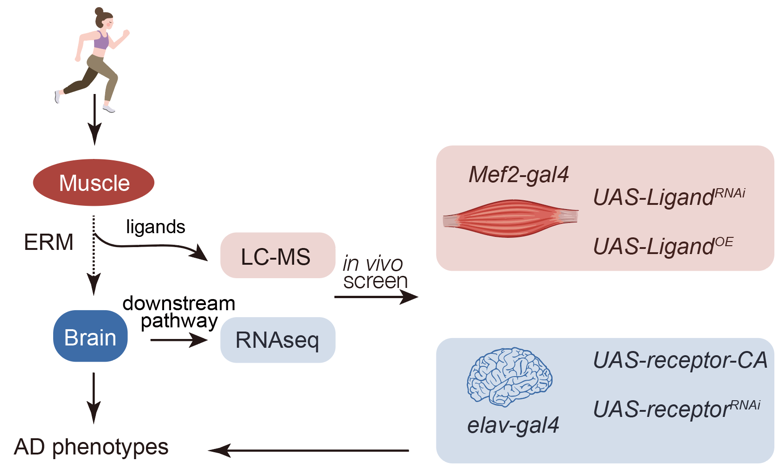 综上,研究运动保护作用的机制,深入探索ERM/AD的相互作用,模拟运动效应,认识不同器官之间的协同作用,进而寻找更为高效的神经保护性肌肉因子NPERM,针对普遍缺乏运动能力或者运动意愿老年人,制定有效缓解和防治AD的临床应用措施,具有重要的现实价值。本课题组将建立果蝇-斑马鱼-小鼠三级筛选体系,寻找新型NPERM,并通过积极与临床医生合作,寻求转化应用(图5)。