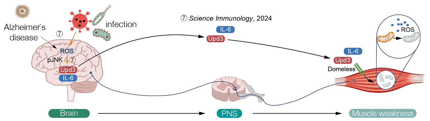 我们的研究首次发现了中枢神经系统可不依赖于神经连接体,直接影响肌肉生理功能,并鉴定出Upd3/IL-6蛋白作为ICN分子,参与“大脑-肌肉”交流,从而为针对性开发统一药物提供了理论基础(图4,通路⑦,Science Immunology, 2024)。未来,我们将进一步探索JAK/STAT通路影响线粒体功能的具体分子机制,欢迎有兴趣的同学参与该项研究。
