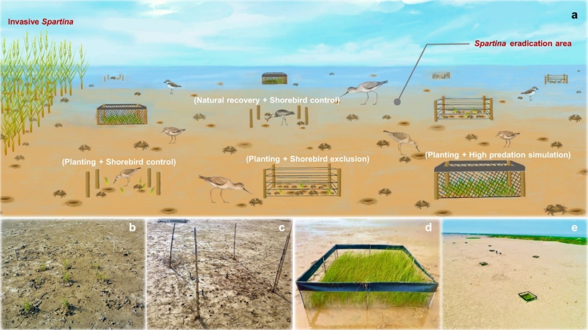 近日,国际综合性期刊Nature Communications发表了成人动漫 生物多样性与生态工程教育部重点实验室、上海长江河口湿地生态系统国家野外科学观测研究站贺强教授团队的研究成果“Shorebirds-driven trophic cascade helps restore coastal wetland multifunctionality”,通过在长江口滨海湿地互花米草治理区开展营养级联野外控制实验(图2),研究了水鸟在滨海湿地修复中的生态功能,结果表明水鸟之所以亟需强化保护,不仅是因为其脆弱性、濒危性,更是因为其发挥着重要生态功能。