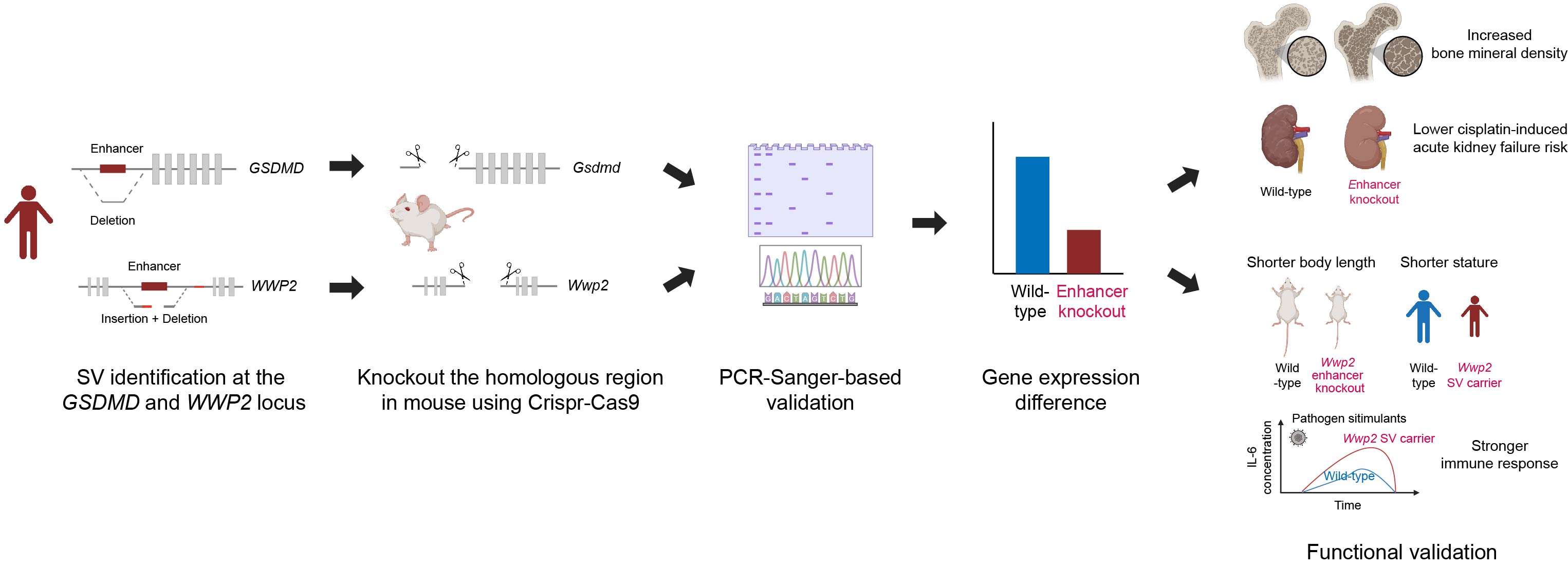 SV的功能研究对于理解基因组变异如何影响人类的表型多样性及疾病易感性至关重要。接下来,研究人员重点对两个SV进行了深入探究。通过基因注释、GO/KEGG富集分析等方法,在免疫通路富集的基因中,发现一个长度约为2.2 Kb、等位基因频率为0.43的缺失。该SV删除了GSDMD最长的转录本(NM_001166237.1)的第一个外显子。进一步结合人类表型数据与多组学数据,利用小鼠敲除模型,研究者证实该SV影响骨密度和顺铂诱导的急性肾损伤表型。进一步分析表明,这一SV可作为快速且经济有效的生物标志物,用于评估顺铂诱导的急性肾损伤风险。此外,基于黑猩猩、古人类及千人基因组计划中的现代人类基因组数据,研究人员推测该缺失可能起源于现代人类和古人类的共同祖先。