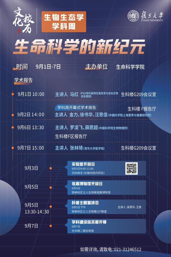 以“生命科学的新纪元”为主题的生物生态学学科周是29场“学科周”中的第一场。今起至9月7日,成人动漫 将组织举办包括高端学术报告、祖嘉博物馆参观、科普讲座、学科风采展示、实验室开放日等一系列活动。本月,口腔医学学科周、基础医学学科周还将接力举办,欢迎师生校友积极参与。